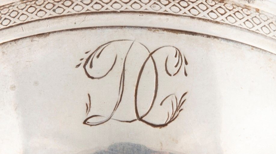 dalle analoghe caratteristiche con vaschetta semisferica sottolineata lungo la circonferenza da fascia bulinata; una coppia reca iniziali D.C. incise e poggia su tre gambe con protomi leonine; la terza con mascheroni. Provviste di vaschette in vetro intagliato non pertinenti