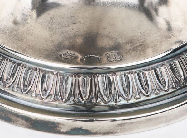 a forma di coppa con manici sagomati ad estremità zoomorfa, profili a palmette, coperchio a cupolino dominato da pigna