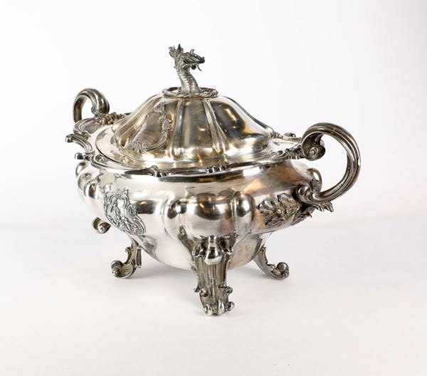 di forma ovale con corpo bombato percorso da nervature, poggiante su quattro piedi in forma di ampio cartiglio dalle estremità ricurve; coperchio sormontato da presa scultorea a guisa di testa di drago con mano sinistra tra le fauci e stemma araldico entro cartiglio cui corrisponde dall'altro lato dedica incisa "presented to Sir Thomas Phillips Jr. by upwards of six hundred subscribers from the british public 1840"; manici arcuati congiunti al corpo da tralci di quercia in rilievo
