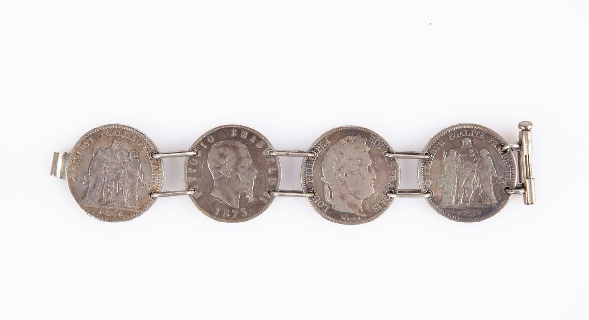 Bracciale con quattro monete in argento: 5 franchi Francia Luigi Filippo 1832 Tolosa, Terza Repubblica 1873 Parigi e 1874 Bordeaux - 5 lire Vittorio Emanuele II 1873 Regno d'Italia Milano.