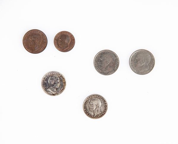 Lotto monete Vittorio Emanuele III Regno d'Italia: 5 Lire 1929; 1 Lira 1915; 50 cts. 1920 bordo rigato; 50 cts. 1920 bordo liscio; 10 cts. 1931; 5 cts. 1931