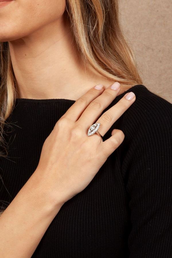 Oro bianco 750/000. Diamante solitario centrale in taglio rotondo billante ct. 0,80 ca. e diamanti in taglio rotondo brillante intorno ct. 0,70 ca.