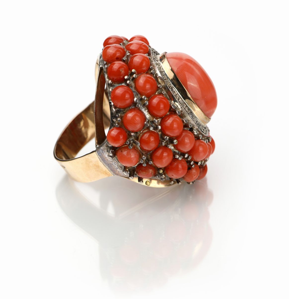 Anello in oro, argento corallo e diamanti