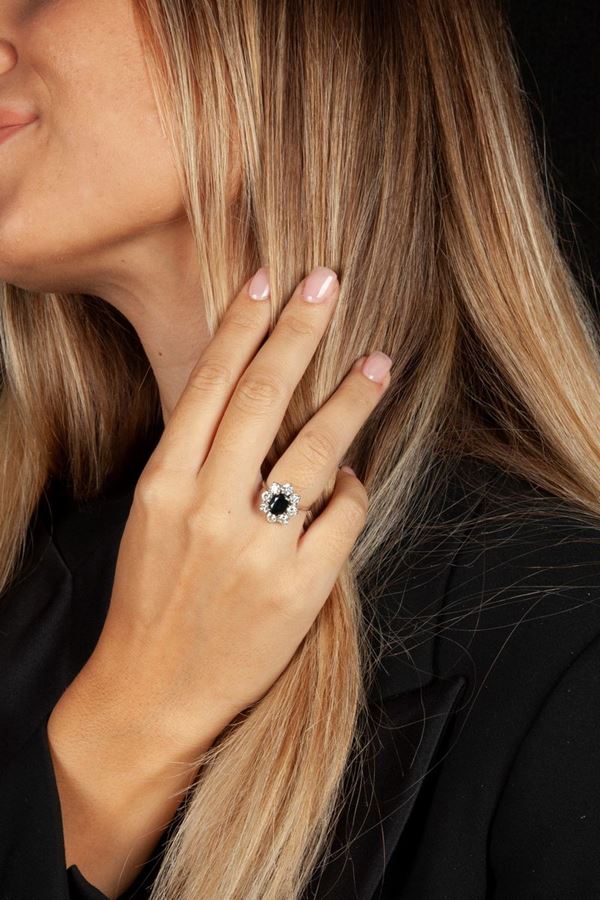 Oro bianco 750/000. Zaffiro in taglio ovale ct.1,50, diamanti in taglio rotondo brillante, ct. 1 ca. Peso complessivo gr. 4,60.