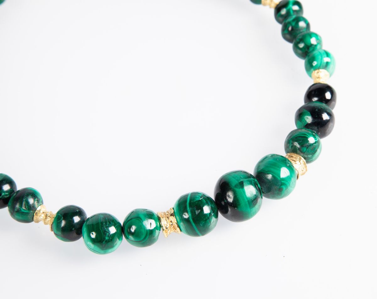 Oro giallo 750/000, malachite taglio sferico da mm. 9 a mm. 19. Peso complessivo gr. 166