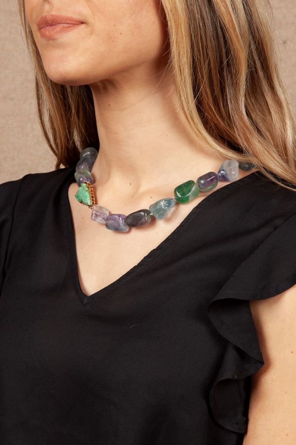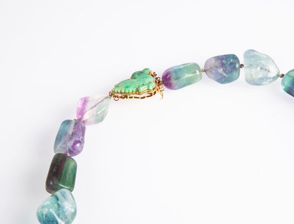 Chiusura in oro giallo a basso titolo 585/000 ed elemento animalier in giada; fluorite taglio pepita mm 18 ca.