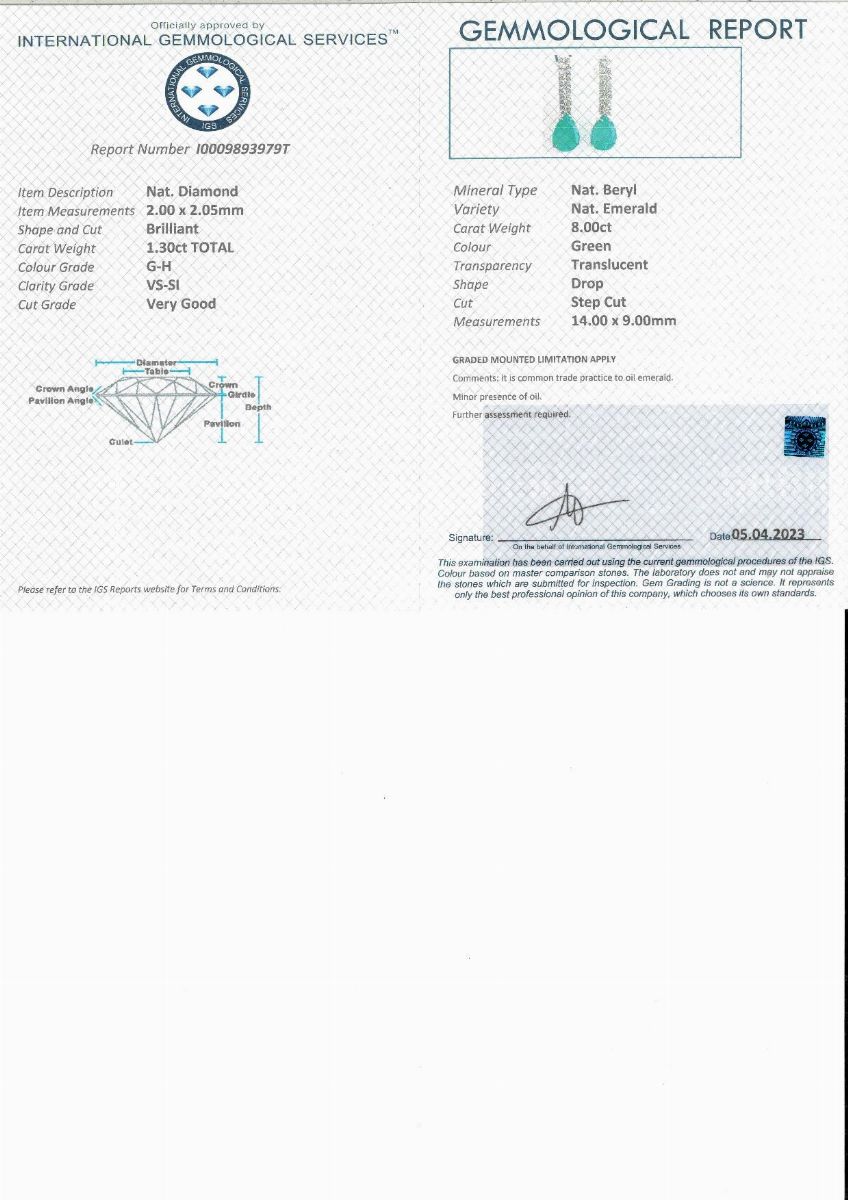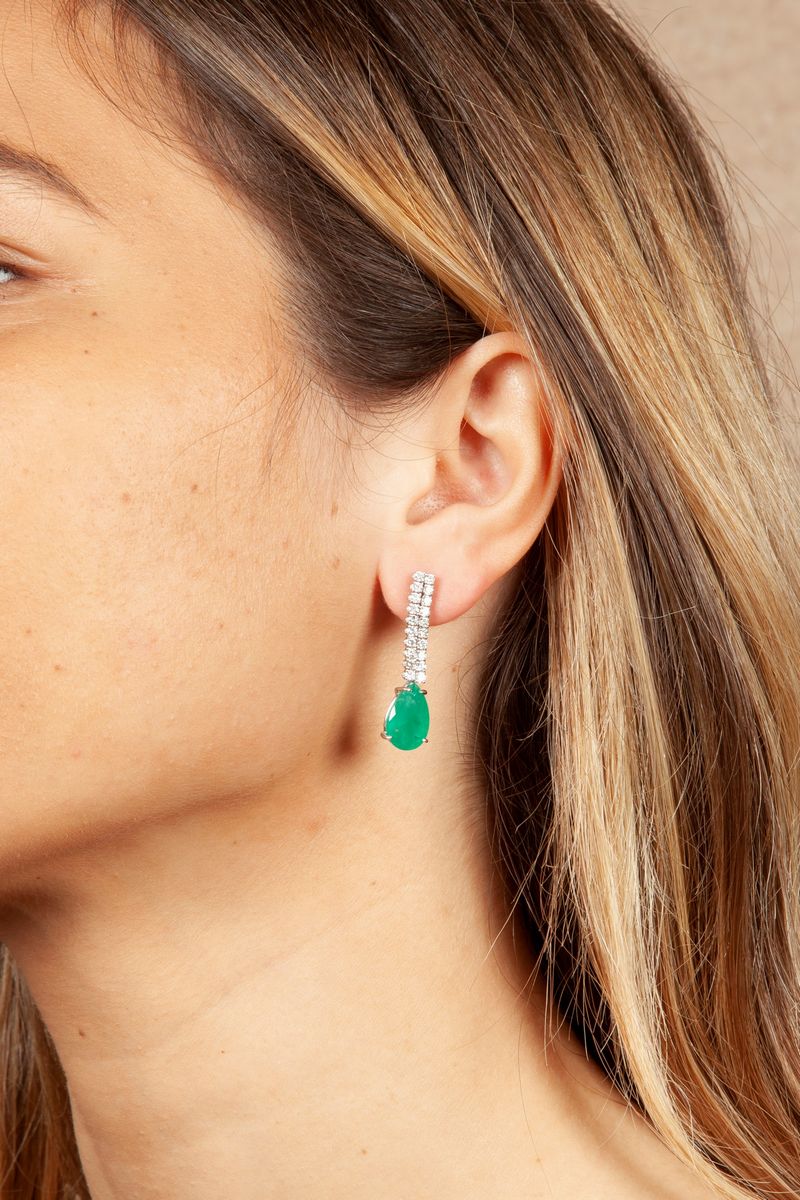 Oro bianco 750/000. Diamanti in taglio rotondo brillante ct. 1,30 G-H VS-SI, smeraldi in taglio goccia ct. 8. Peso complessivo gr. 7,80. Corredati di certificazione gemmologica.