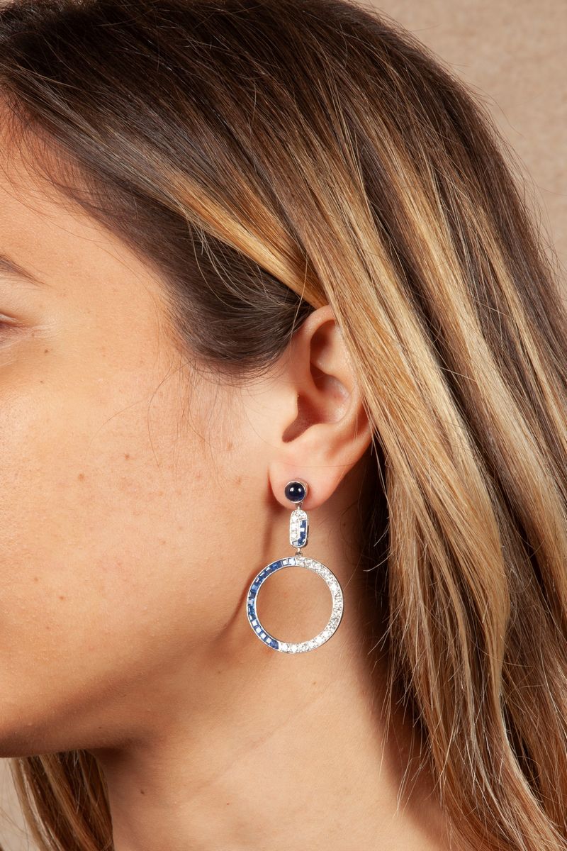 Oro bianco 750/000. Diamanti in taglio rotondo e taglio old mine. Diamanti centrali ct. 1,40, smeraldi in taglio rotondo. Peso complessivo gr 10,70.