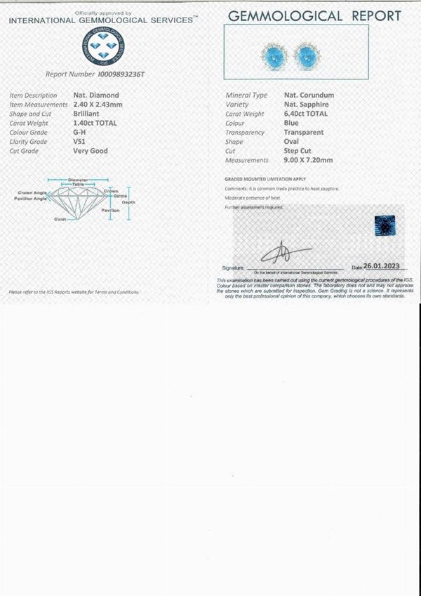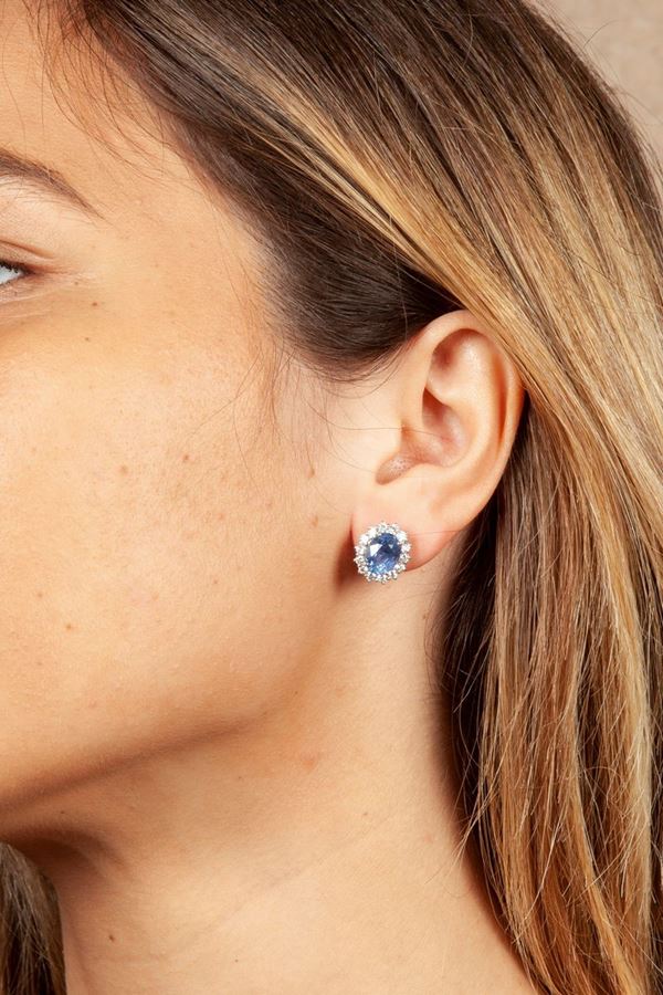 Oro bianco 750/000, diamanti in taglio rotondo brillante ct. 1,40 G-H VS1, zaffiri ct. 6,40. Peso complessivo gr 5,30. Corredati di certificazione gemmologica.