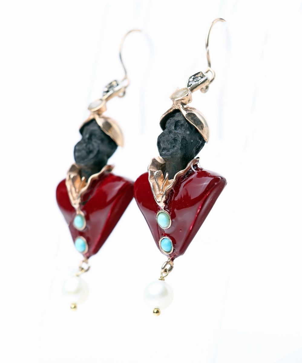 Coppia di orecchini, moretto in oro, argento, smalto, turchese e perla.