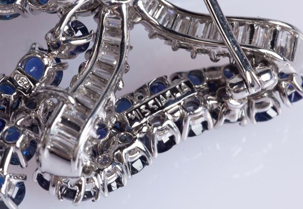 Oro bianco 750/000. Diamanti in taglio gradini e navette ct.3 ca. prob G VVS1, zaffiri ct. 2,50 ca. Peso complessivo gr. 12,70. Corredata di custodia originale.