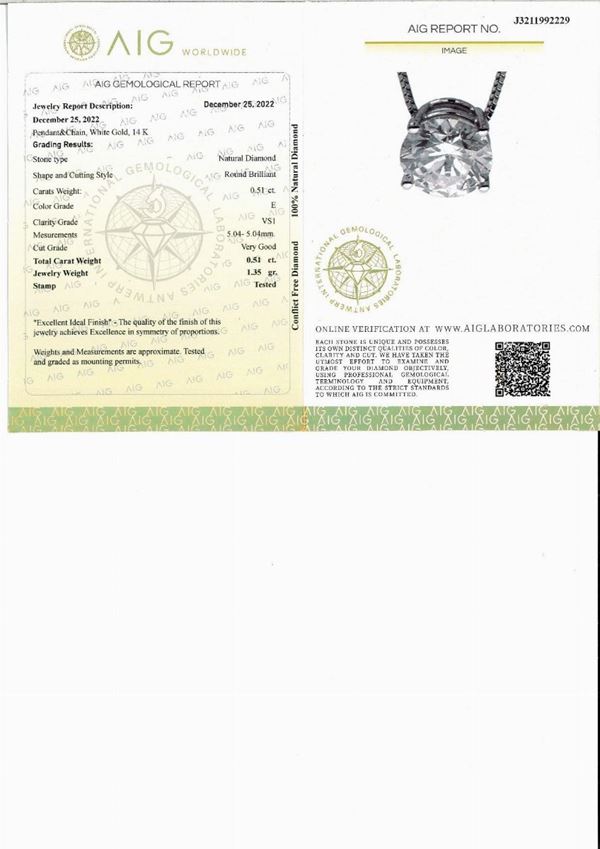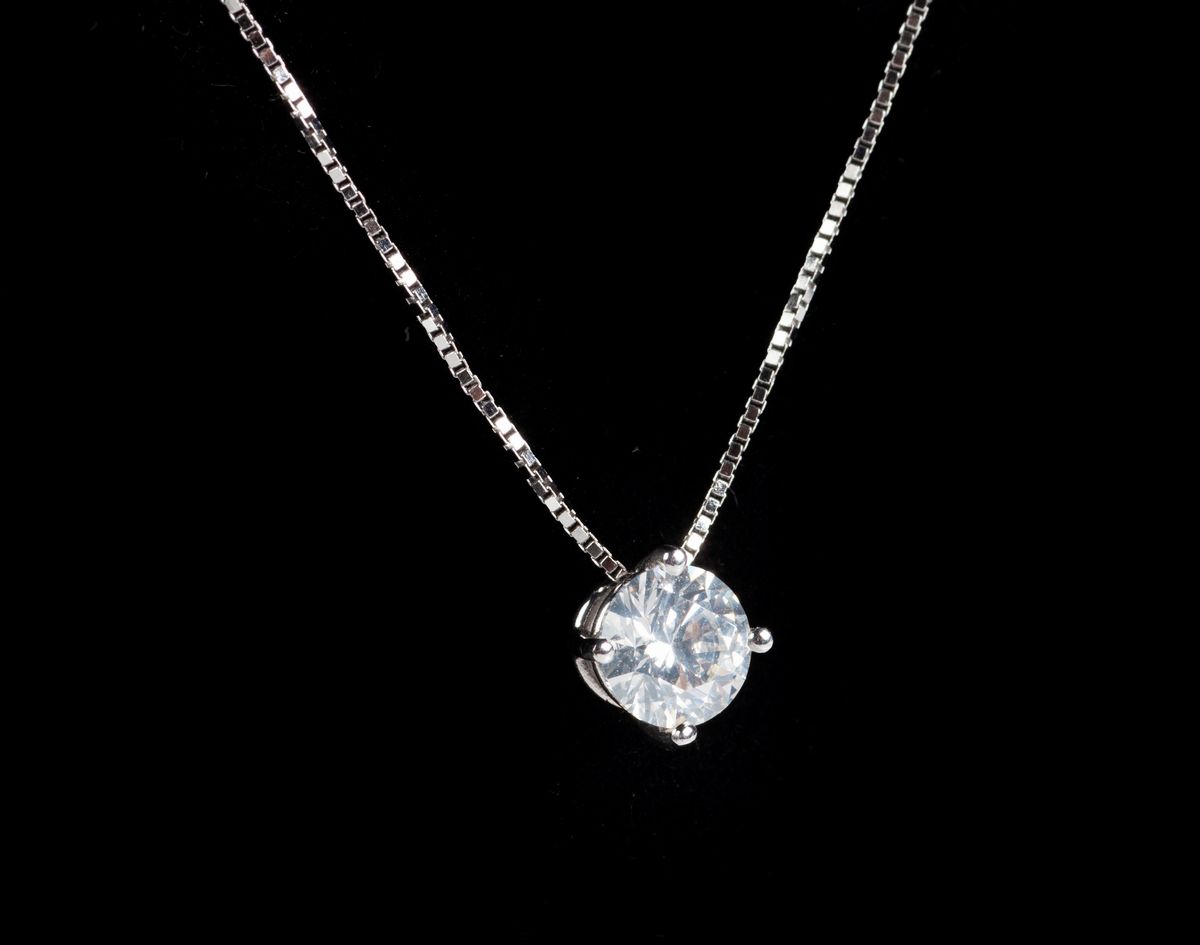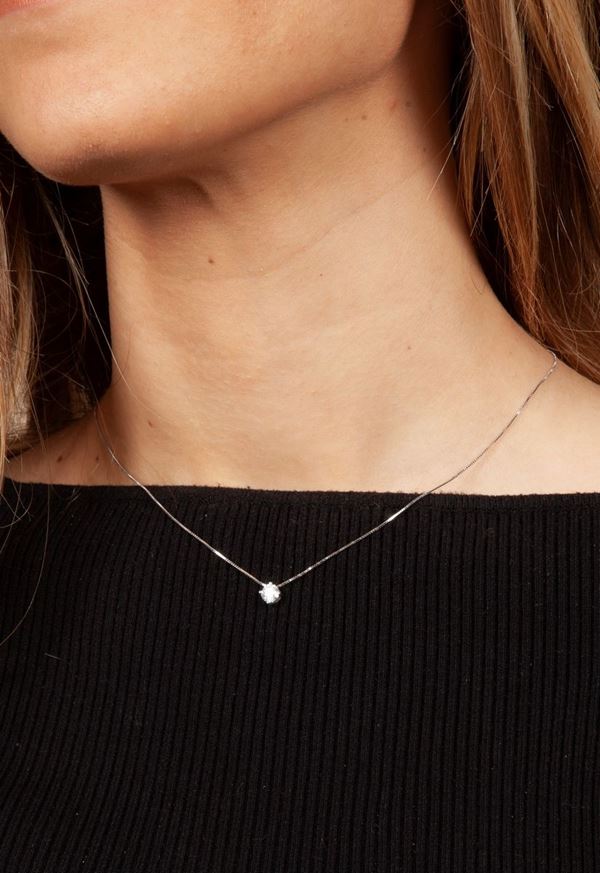 Oro bianco 750/000. Diamante naturale in taglio rotondo brillante ct. 0,51 E - VS1. Corredato di certificazione gemmologica. Peso complessivo gr. 1,40
