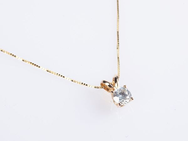 Oro giallo 585/000. Diamante centrale in taglio rotondo brillante, ct. 0,56 , G- SI1. Peso complessivo gr. 1,50.
