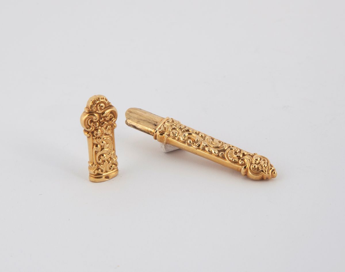 Oro giallo 750/000,interamente decorato da volute vegetali e cartigli sbalzati. Peso complessivo gr. 4,50.