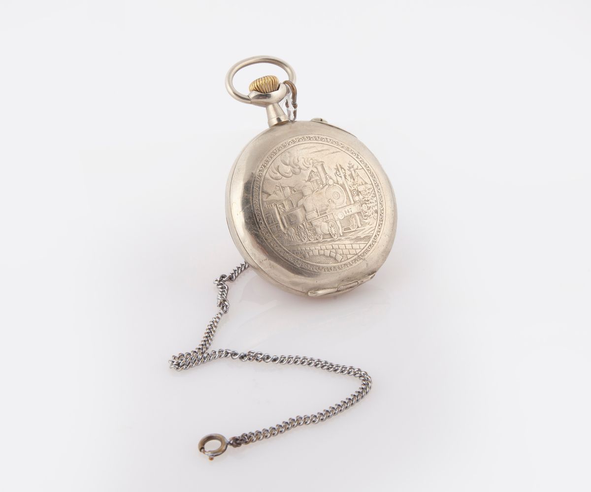 Funzionante. Parapolvere in metallo. Con incisione raffigurante un treno sopra un ponte in paesaggio sulla cassa. Difetti al quadrante. Con catena in metallo non pertinente.