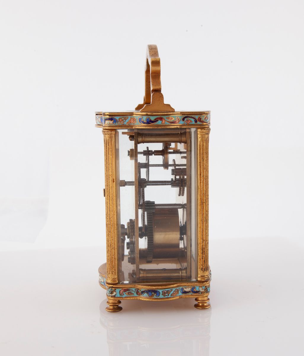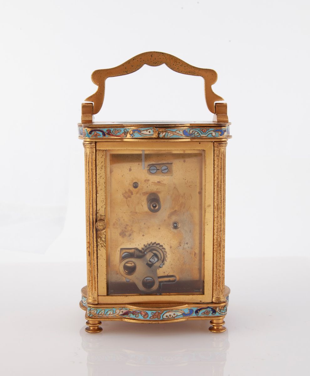 Cappuccina a carica manuale con cassa in ottone e smalti. Manifattura francese, quadrante in metallo firmato Rattray & Co Dundee. Prima metà XX secolo