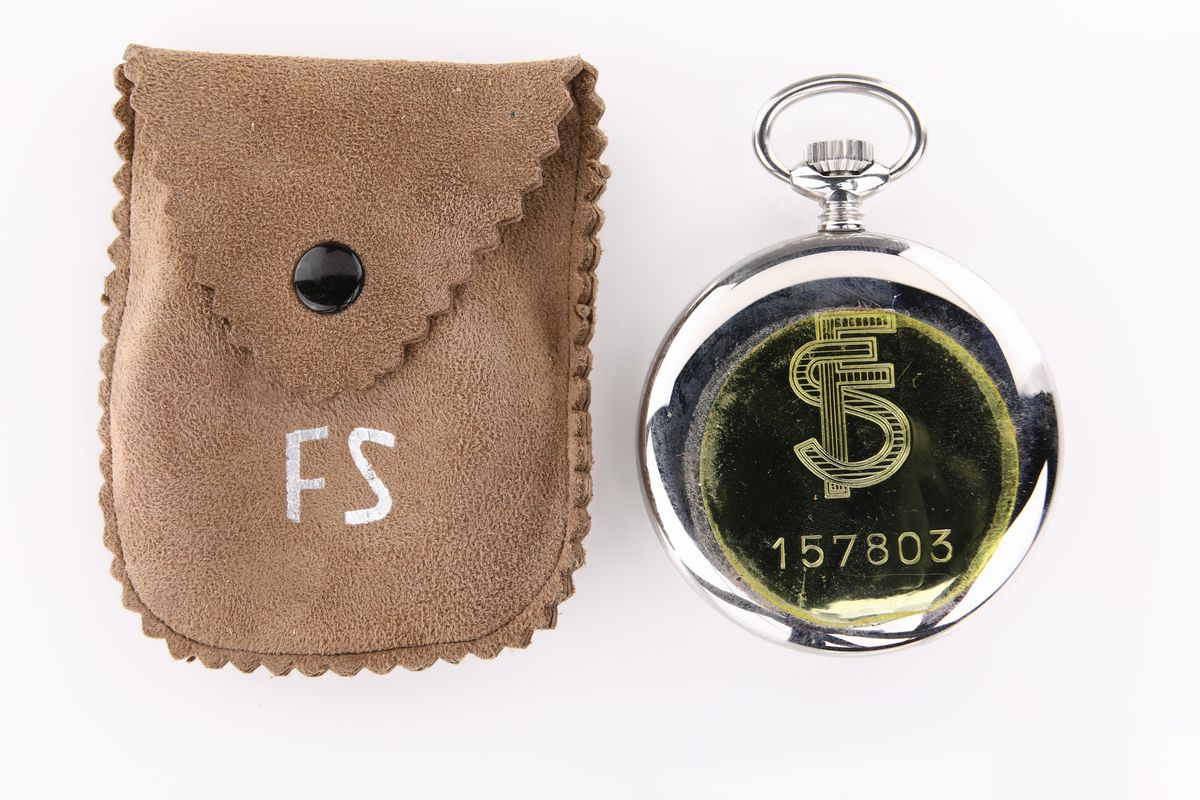 Funzionante. Come nuovo. Reca inciso sulla cassa FS 157803. Movimento meccanico a carica manuale, Incabloc. Entro astuccio originale in pelle Ferrovie dello Stato con incise le lettere FS