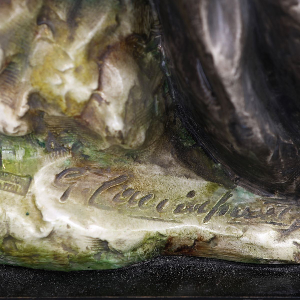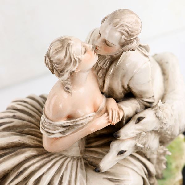 raffigurante una scena galante e cani levrieri; base rettangolare gradinata in legno ebanizzato. Firma sulla base: G. Cacciapuoti
