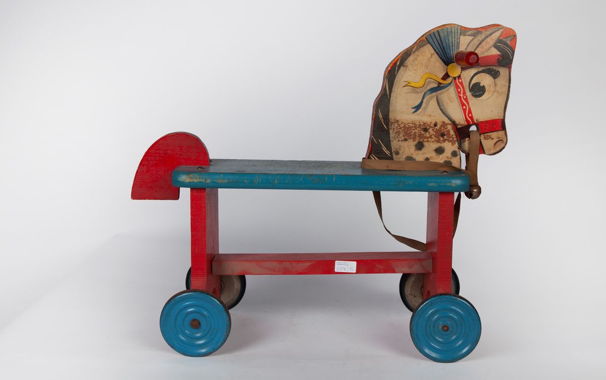 Cavallino a traino in legno dipinto con rotelle in metallo, Gong Bell Manufacturing Company, U.S.A. prima metà del XX secolo