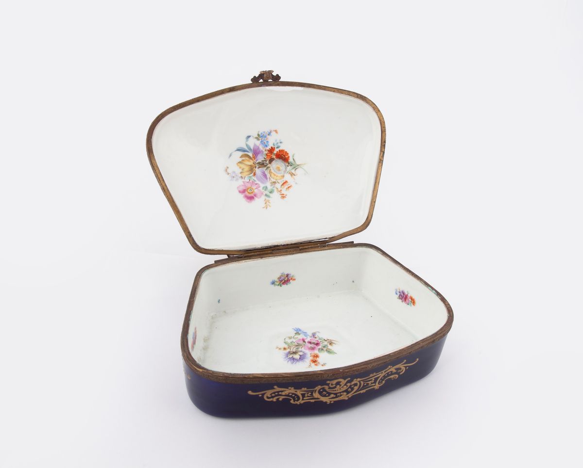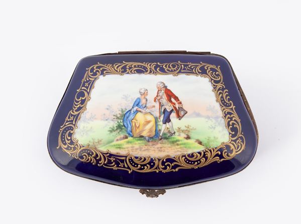 di forma trapezoidale con profilo e cerniera in metallo dorato, decorato da volute dipinte in ro su fondo bleu royal; sul coperchio una scena galante con figure in abiti settecenteschi; all'interno composizioni floreali sparse su fondo bianco. Marca N coronata in oro sotto la base