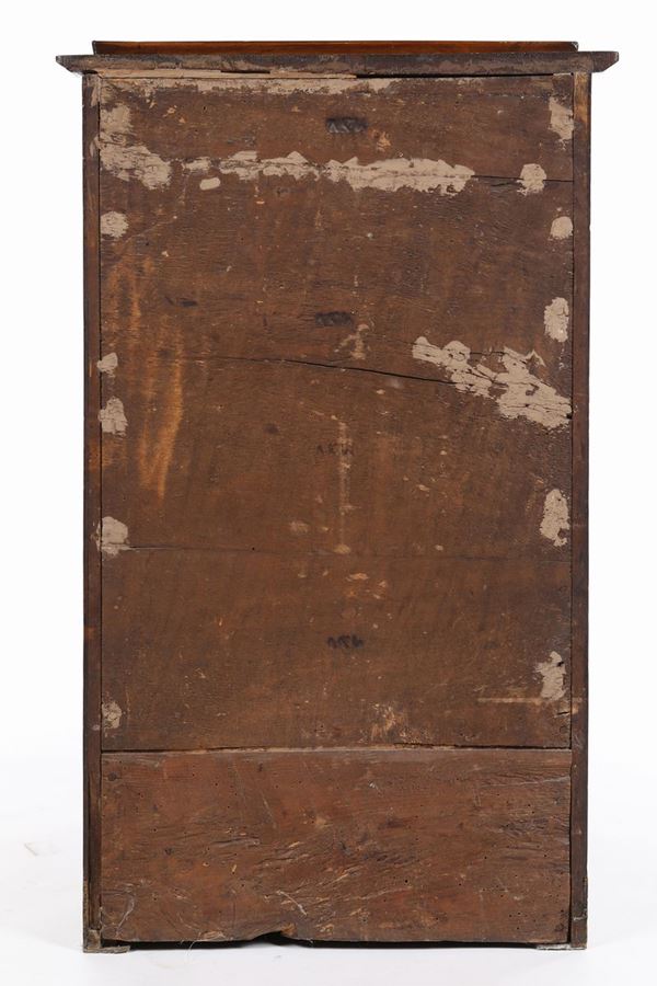 con piano rettangolare racchiuso da profilo rialzato su tre lati; facciata scandita da un cassetto nella fascia e uno sportello sottostante delimitato da colonne con manicotti in bronzo