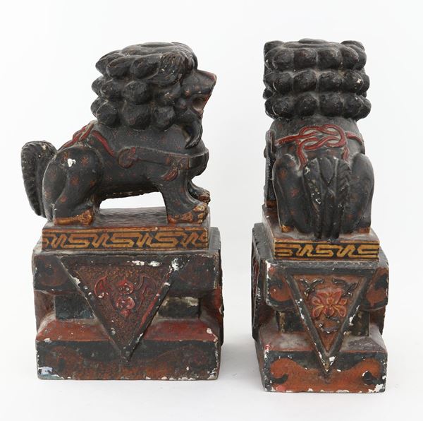 Coppia di leoni guardiani buddisti in pietra dipinta