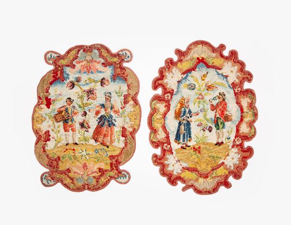 Due ricami a piccolo punto di diversa sagoma a forma di cartiglio