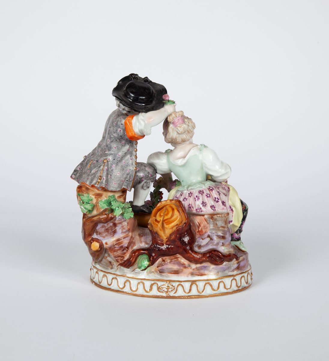 raffigurante allegoria della primavera interpretata da una giovane con ghirlanda affiancata da un giovane che le pone sul capo dei fiori; da un modello creato nel 1778 da Michel Victor Acier durante la direzione della manifattura del Conte Camilo Marcolini. Marca spade incrociate con stella e segno in blu sottosmalto