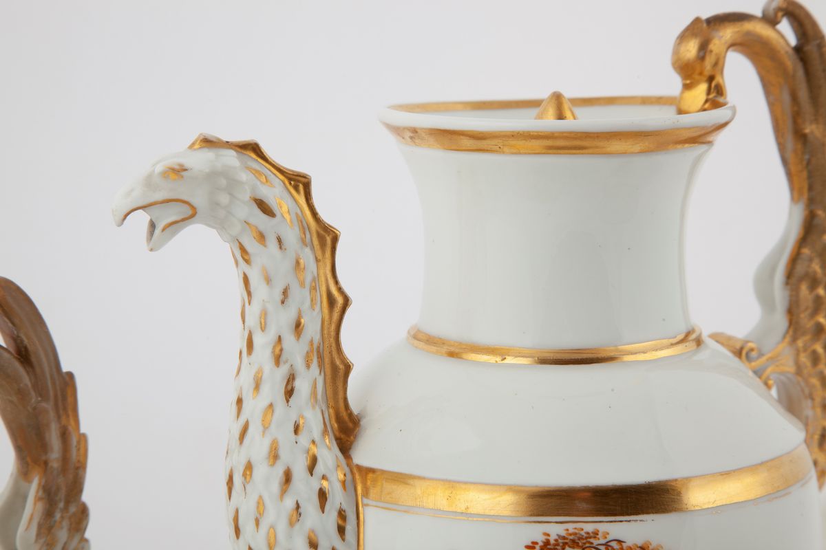 caratterizzato da forme di gusto Impero con anse modellate a figura di rapace, composto da teiera, lattiera, zuccheriera ed una tazza con piattino; ogni elemento è decorato da una scena di genere interpretata da un bimbo ambientato in un paesaggio minimo dipinti in vivace policromia e oro. Marca AP in cirillico sotto ogni elemento. La manifattura Popov nacque nel 1806 a Gorbunowo con l'inglese Charles Milly, cui seguì in poco tempo Alexander Popov. La fabbrica cessò l’attività nel 1872