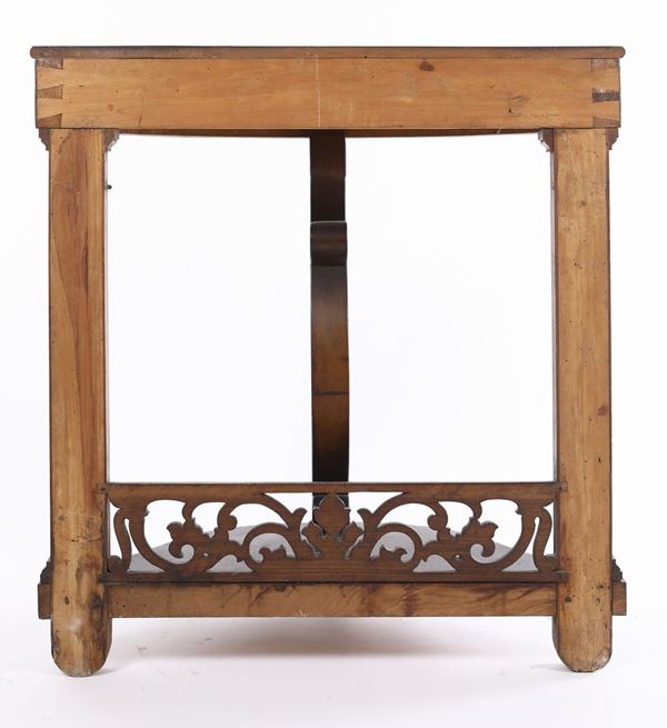 caratterizzata da due piani collegati da un montante centrale incurvato; sostegni posteriori a lesena, riuniti fra loro da una cartella traforata a volute vegetali