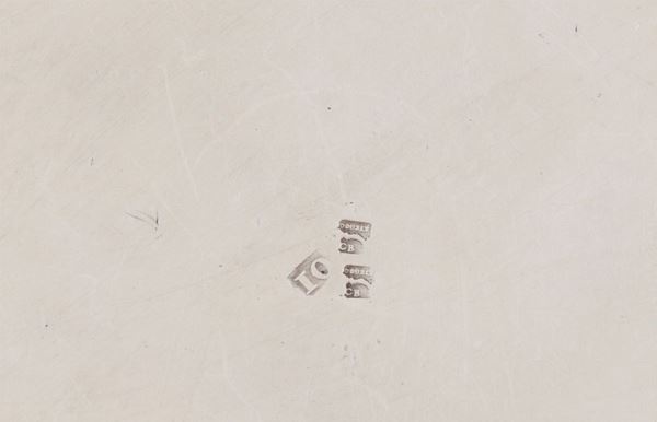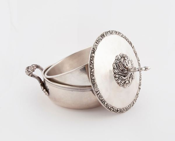 Coppia di portavivande in metallo argentato con coperchio, Francia,