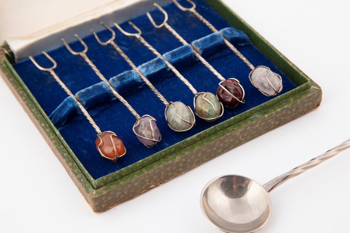 Un cucchiaio e sei forchettine da cocktail in metallo argentato con pietre dure