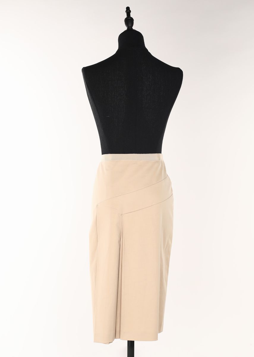Taglia 44, con tasca americana, chiusa con cerniera invisibile sul fianco sinistro (cursore con logo in metallo). Sul retro due pieghe.