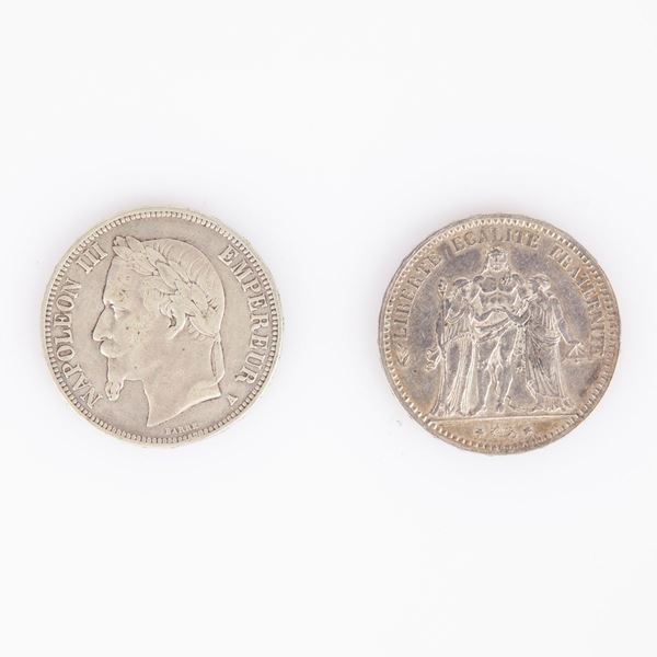 2 monete da 5 Franchi Francia: 1869 Parigi Napoleone III e 1876 Parigi Terza Repubblica