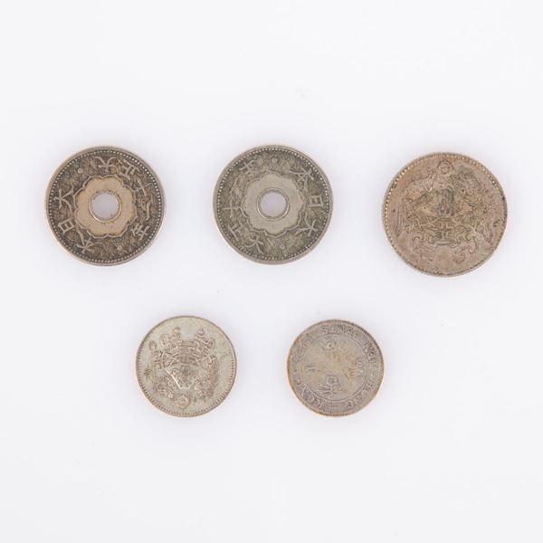 5 piccole monete Cina e Giappone: 20 Fen 1926 per Matrimonio di Pu Yi Cina Repubblica; 10 Fen 1926 per Matrimonio di Pu Yi Cina Repubblica; 10 Cents 1902 Hong Kong Edoardo VII; 2 esemplari 10 Sen 1921 Yr.10 Yoshihito Giappone.