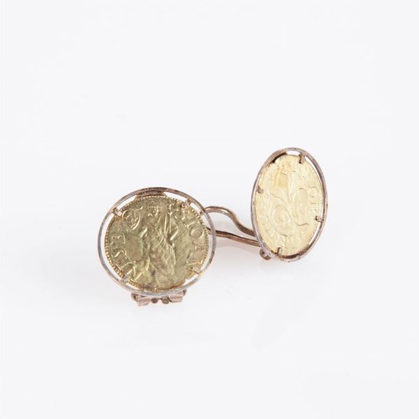 Coppia di orecchini in metallo dorato con imitazione di una moneta da un fiorino