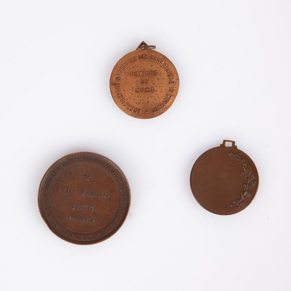 Lotto 3 Medaglie di bronzo: Benemerenti Lega italiana per l'istruzione 18 marzo 1877; Associazione nazionale Carabinieri Sezione di Roma; Medaglia per la Vittoria