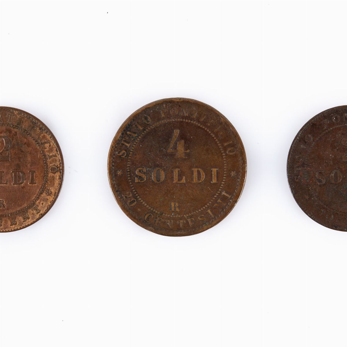 Lotto 5 monete Stato Pontificio: 4 Soldi 1869 A.XXIII Roma; 2 Soldi 1866 Anno XXI (variante Cent.) Roma; 2 Soldi A.XXI 1867 Roma; 1 Soldo II° Tipo Busto Grande A.XXI 1866 (data grande) Roma; 1 Soldo II° Tipo Busto Grande A.XXI 1867 (data piccola) Roma