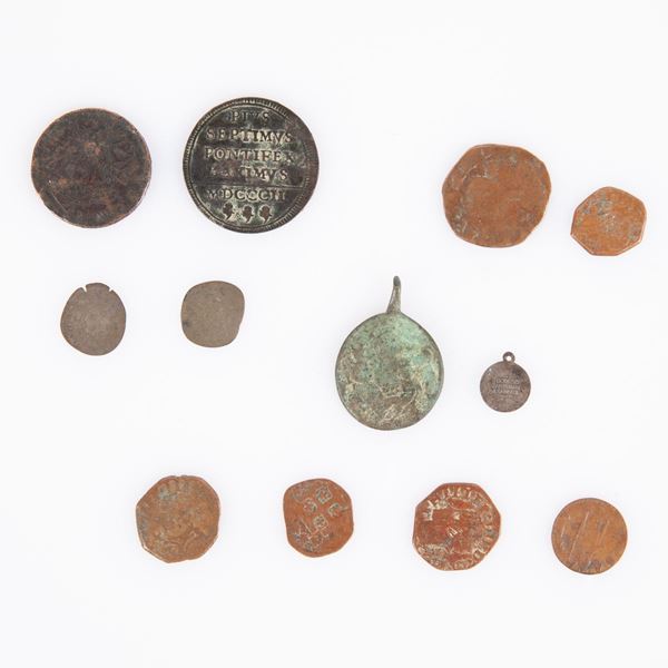 Lotto di 10 monete in rame Stato Pontificio e Regno di Napoli e di Sicilia e 2 medagliette votive in rame