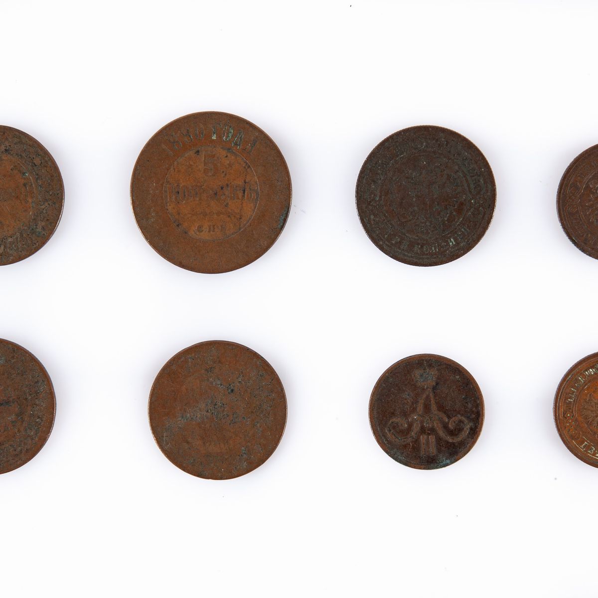 Lotto di 8 monete Impero Russo: 5 Kopeki 1880; 3 Kopeki 1879, 1880, 1899, 1903; 2 Kopeki 1881, 1912 San Pietroburgo Zar Nicola II; 1 Kopeko 1866 EM Ekaterinburg Zar Alessandro II