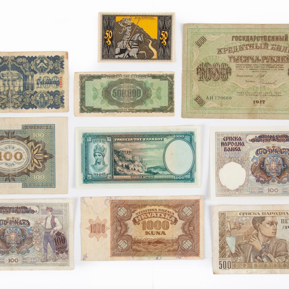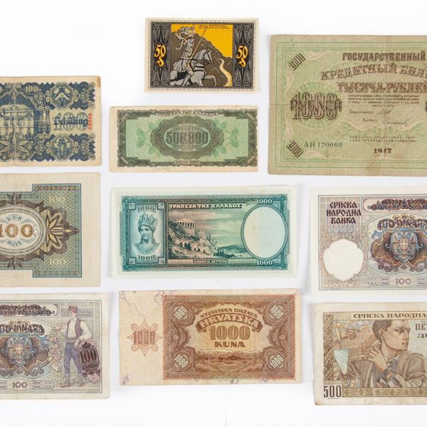 Lotto di Cartamoneta: 2 Esemplari 100 Dinari 1941 Soprastampati Serbia Occupazione tedesca; 500 Dinari 1941 Serbia Occupazione tedesca; 1.000 Rubli 1917 Russia Governo provvisorio; 1.000 Kuna 1941 Croazia; 1.000 Dracme 1939 Regno di Grecia; 500.000 Dracme 1944 Regno di Grecia; 100 Marchi 1920 Repubblica di Weimar Germania; 100 Scellini 1945 Austria; Notgeld 50 Pfenning 1921 Bad-Blankenburg Germania