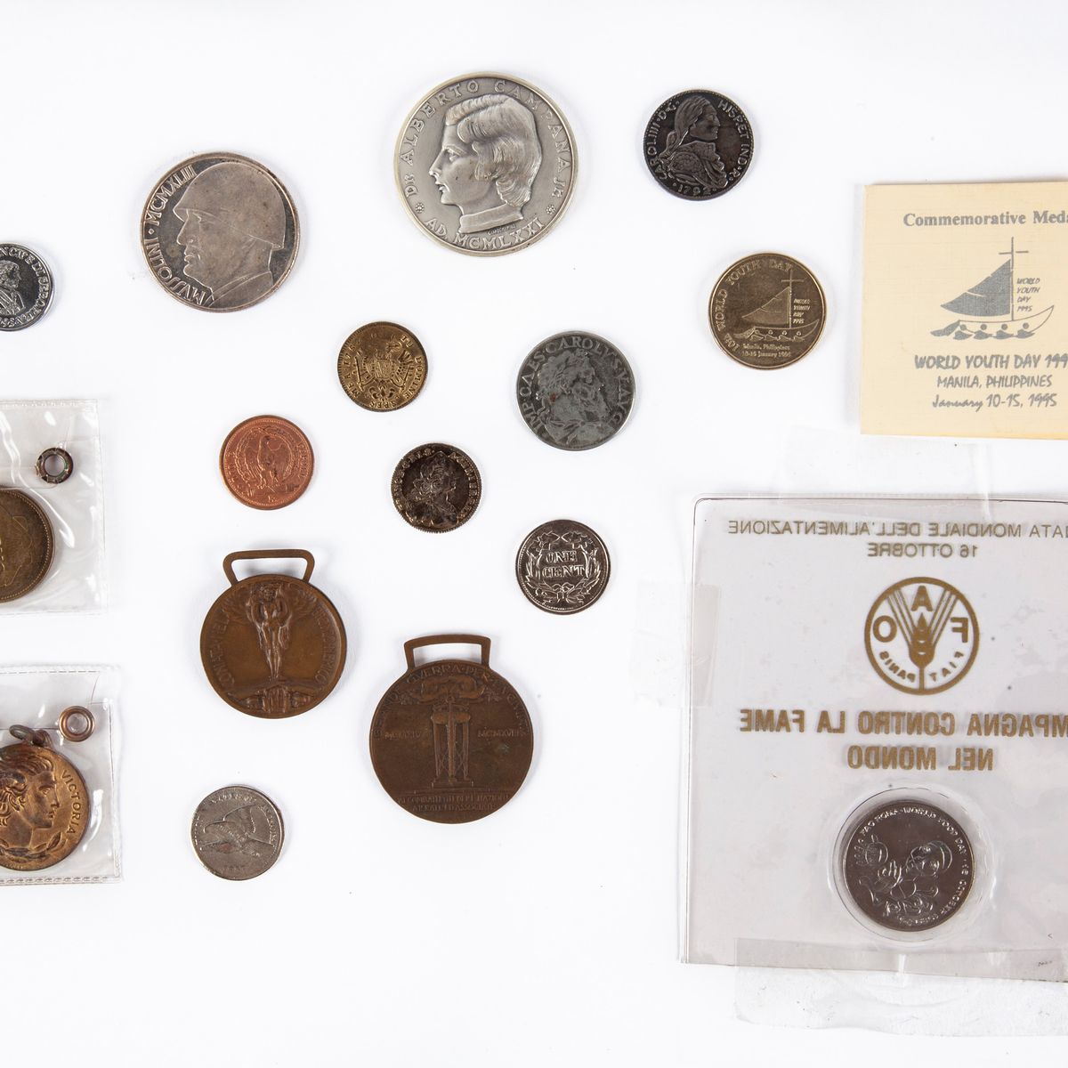 Lotto di Medaglie: Sergio Giandomenico - Medaglia in argento 800/000 di Alberto Campana 1971; 2 medaglie commemorative in bronzo della Guerra 1915-18 (Medaglia della Vittoria e medaglia Coniata nel bronzo nemico). Unito un Lotto di 13 medaglie, gettoni e riproduzioni di monete