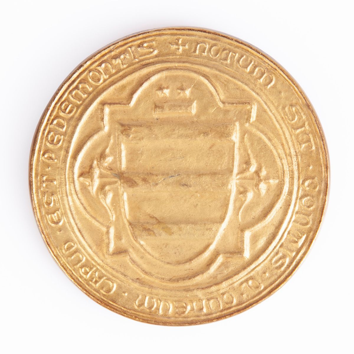 Medaglia città di Cuneo in bronzo dorato e smaltato con Stemma e Riproduzione del sigillo trecentesco della città: NOTUM SIT CONTIS Q CUNEUM CAPUD EST PEDEMONTIS
