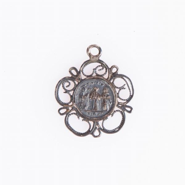 Medaglietta votiva con 5 santi in argento datata 1671 con montatura in filigrana d'argento