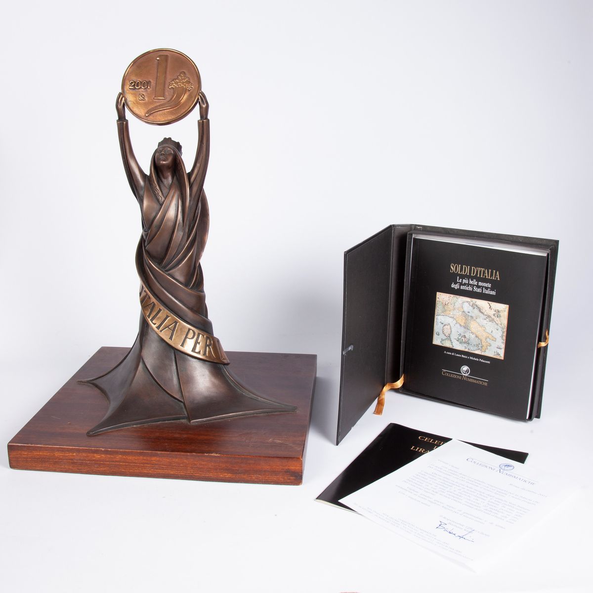 Tiratura di 199 esemplari, nostro 108. Scultura in bronzo a cera persa, brunito e patinato raffigurante l'allegoria dell'Italia Turrita che regge una moneta con al dritto una lira del 2001 e al rovescio una lira di Vittorio Emanuele II. Fonderia Venturi Arte, Bologna. Supporto di legno. Con libretto di accompagnamento.