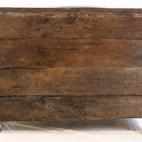 con facciata ad andamento mistilineo suddivisa in quattro cassetti racchiusi da cornici ebanizzate, decorati ognuno da intarsi in legno di frutto; piedi a mensola