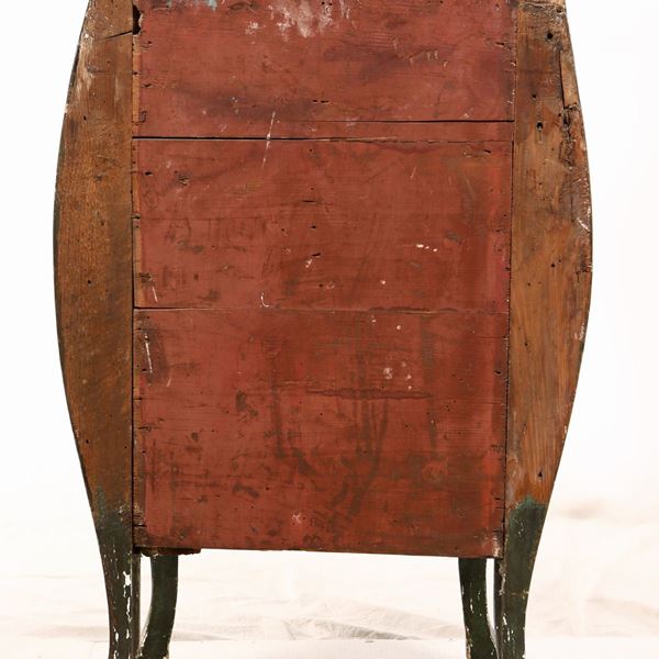 decorato a chinoiséries dorate; corpo sagomato con facciata suddivisa in tre cassetti, spigoli curvilinei, piedi sagomati. Difetti