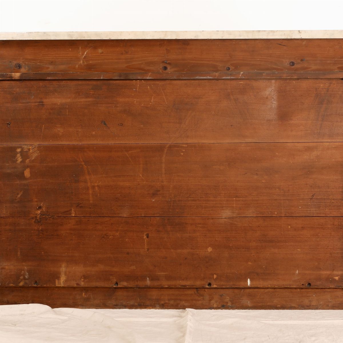 abbellita da rilievi ornamentali in legno e bronzo dorati; piano rettangolare in marmo bianco, un cassetto nella fascia