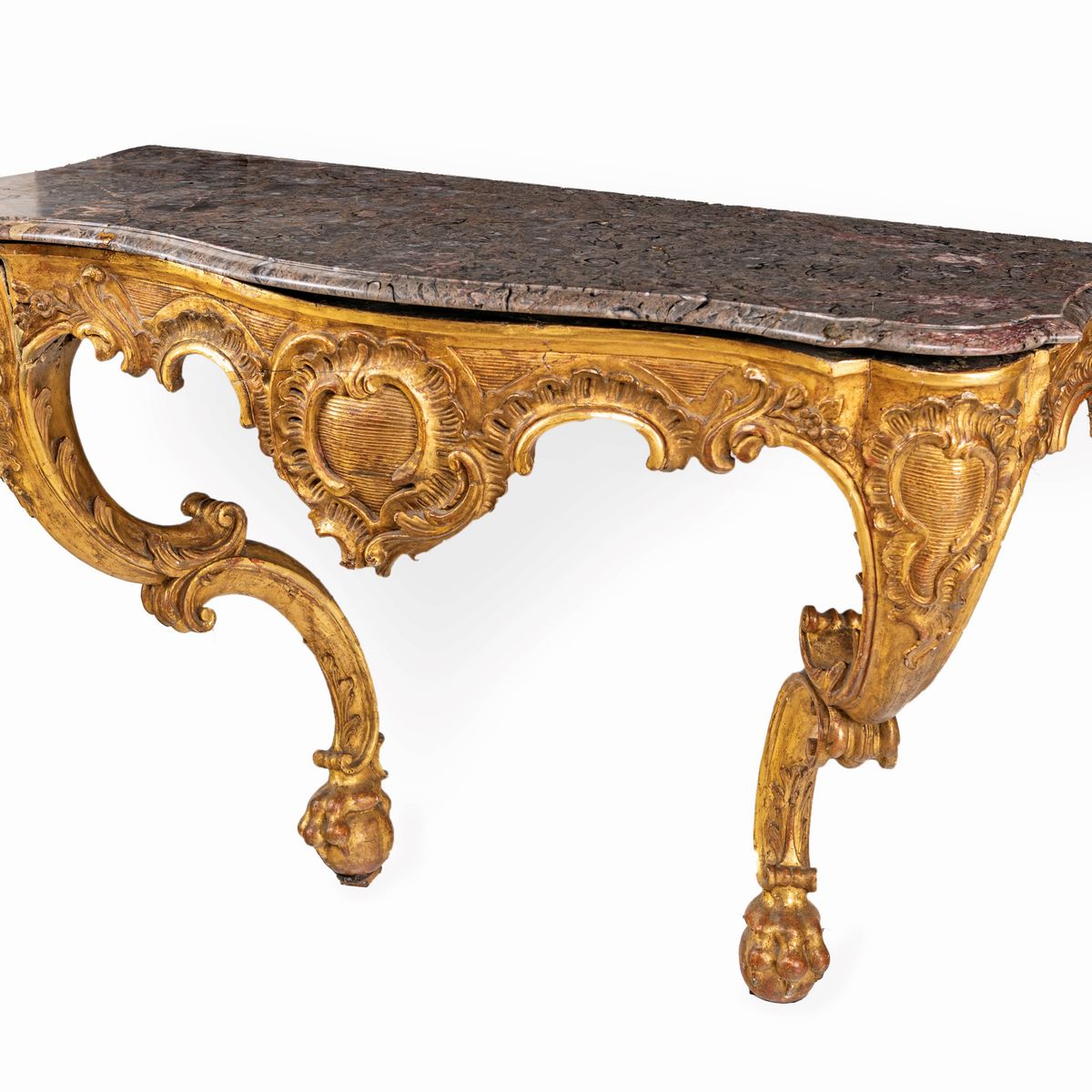 con piano sagomato in marmo, fascia caratterizzata da cartigli e due montanti mossi poggianti su sfere trattenute idealmente da zampe ferine