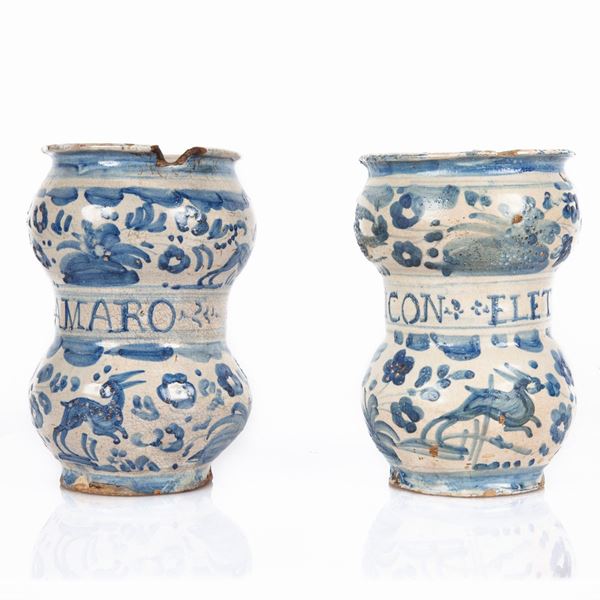 Coppia di albarelli a rocchetto in maiolica bianca e blu